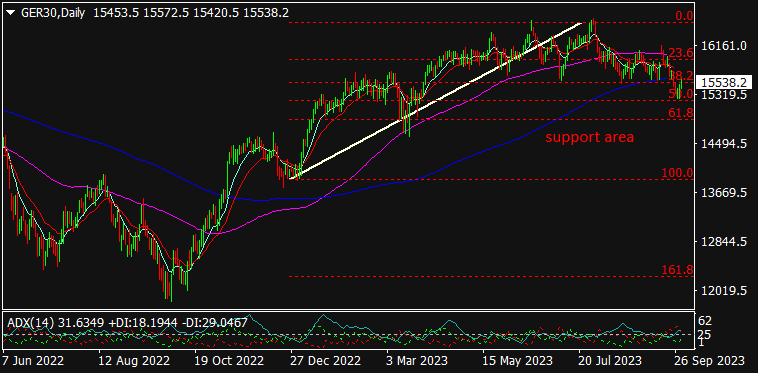 GER30 is trading at 15242.3, 0.17% down since previous close. Like U.S markets, the European stocks seem to be trading on lower side on Tuesday on an account of growing fear over U.S hawkish monetary stance & worsening situation in property market in China. Besides this, the chances of U.S government shutdown remains crucial for GER30 & other global markets. The German Final Manufacturing PMI fell to 39.6 from 39.8 in the previous month & the GFK Consumer Climate fell by 26.5 from 25.6 in the previous month. The result of Final Services PMI data will be closely monitored on Wednesday. As seen in the chart, the index corrected down till Fibo level 50.0 which indicates a reversal momentum if sustained or a breakdown if breached.