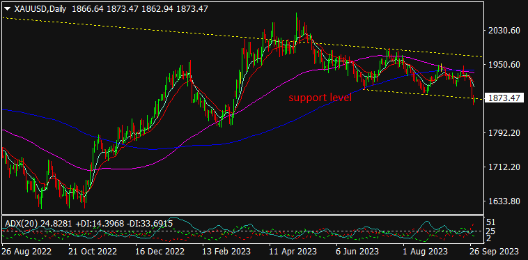 Gold is trading at $1812.44, 0.12% down since previous close. A heavy sell-off can be seen in Gold since last few sessions amid strong USD & rising U.S bond yields as U.S Fed hinted for one more rate hike by end of this year in order to control the sticky inflation rate. Also, the fear looms over chances of U.S government shutdown which may remain vital for gold. The worsening situation can be seen in Chinese property markets & hence, can affect consumption demand of gold since China is a major consumer of metals. Upcoming event of U.S NFP data will remain in focus later in this week. As seen in the chart, the gold slid down to MA (200) & previous lows which acts as major support. Sideways trading may be seen further.
