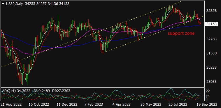 US30 is trading at 34167, 0.09% down since previous day close. The flat to lower side trading can be seen in U.S markets as fear looms over chances of U.S government shutdown with the deadline of one week. Last week, the FOMC Powell hinted over future rate hike in this year followed by two more hikes in the year 2024; leaving the rate steady at 5.50% range in his latest meeting. This made the U.S markets weaker. The steady monetary policy at BoJ & BoE meetings further restricted the momentum in US100. The result of CB Consumer Confidence data will remain into focus for the day. As seen in the chart, the index is trading near previous lows & MA (200) which acts as a major support level & hence, a breakdown can be seen if breaches the current level otherwise a reversal can be seen.