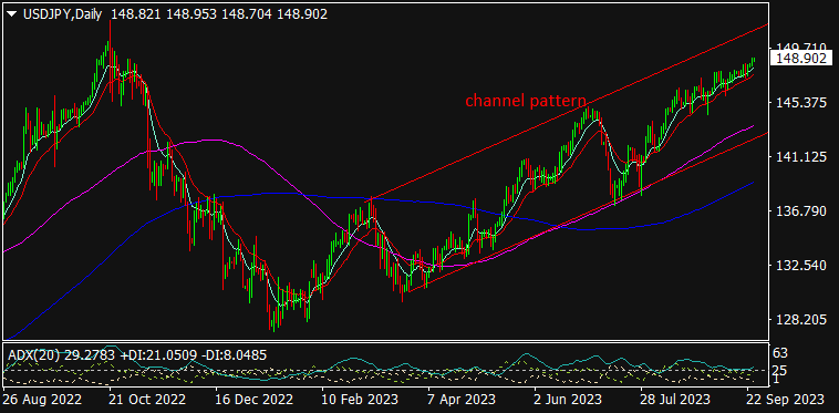 USD/JPY is trading at 148.918, 0.19% down since previous day close. The YEN continued to show negative momentum on Tuesday amid rising U.S bond yields & strong US Dollar Index. Last week, the U.S Fed Powell hinted for one more rate hike in this year; although keeping an interest rate steady at 5.50% in its recent meeting. On regional front, the Bank of Japan (BoJ) left an interest rate steady at -0.10% while the traders were expecting an end to negative interest rate cycle. The Japan’s Flash Manufacturing PMI fell to 48.6 from 49.6 in previous month which further dragged down the USD/JPY. As seen in the chart, the pair is consistently trading above the short-term MA (10) & MA (20) & hence, further selling in YEN may be expected against the USD on daily basis.