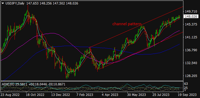USD/JPY is trading at 148.103, 0.12% down since previous day close. The YEN weakened post Bank of Japan (BoJ) meeting wherein an interest rate was held steady at -0.10% while the traders would be expecting an end to negative interest rate cycle. On data front, the Japan’s Flash Manufacturing PMI fell to 48.6 from 49.6 in previous month which further dragged down the USD/JPY. Globally, the strong USD after U.S Fed Powell hinted for one more rate hike in this year; although keeping an interest rate steady at 5.50% in its recent meeting depreciated the major currencies. As seen in the chart, the pair is consistently trading above the short-term MA (10) & MA (20) & hence, further selling in YEN may be expected against the USD on daily basis.