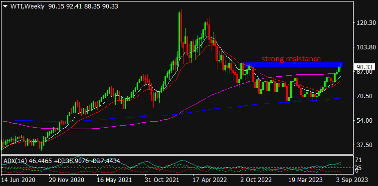 WTI Oil is trading at $90.30, 0.21% up since previous day close. The Oil prices rallied on Friday after Russia bans its fuel exports which affects the supplies of Oil throughout the world since Russia is one of the major suppliers of Crude Oil. This outweighs the negative effect emerging out of U.S Fed’s hawkish stance in near future; though keeping an interest rate steady at 5.50% range. The supply cuts from Saudi Arabia & Russia will remain significant for the prices in long-run. The result of U.S Baker Hughes report will remain in focus for the day. As seen in the chart, the Oil seems to be trading firmly near major resistance of previous highs & hence, a breakout can be seen if breaches the level.